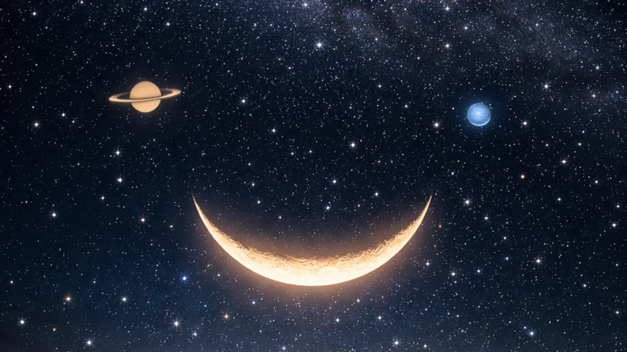 Ay’ın geniş hilal (waxing crescent) evresinde olması, gökyüzünde bir “ağız” izlenimi verirken; Satürn ve Neptün bu “gülümsemenin” üzerinde iki “göz” gibi görünecek. Bu yüzden gökbilim severler arasında olay, “üçlü kavuşum” olarak adlandırılıyor.