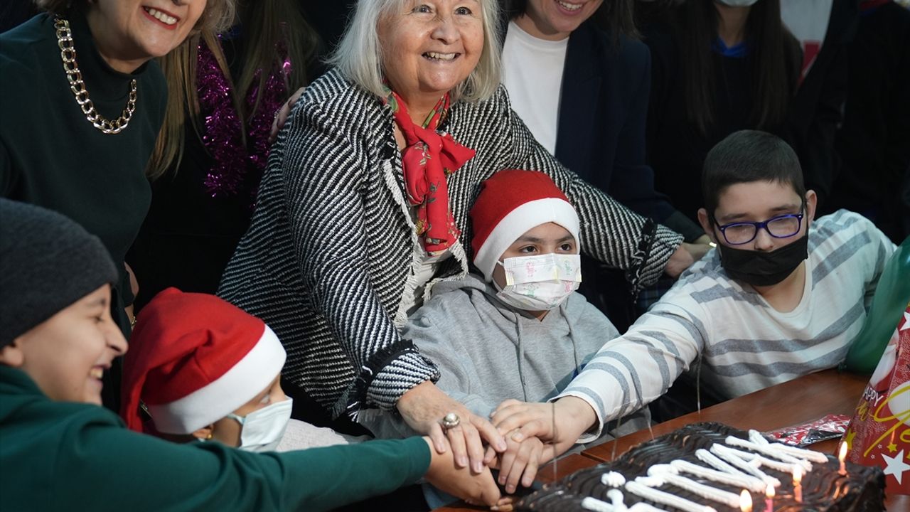 Sağlık çalışanları, vakıf üyeleri, çocuklar ve aileleri yeni yıl pastasını birlikte kesti.