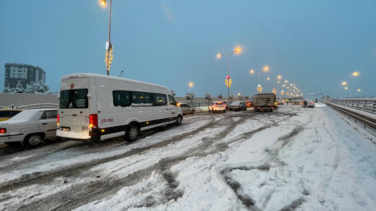 Kara yolundaki Çevik Kuvvet Kavşağı bölgesi kar yağışı nedeniyle bir süre trafiğe kapanırken araçlar uzun kuyruk oluşturdu.